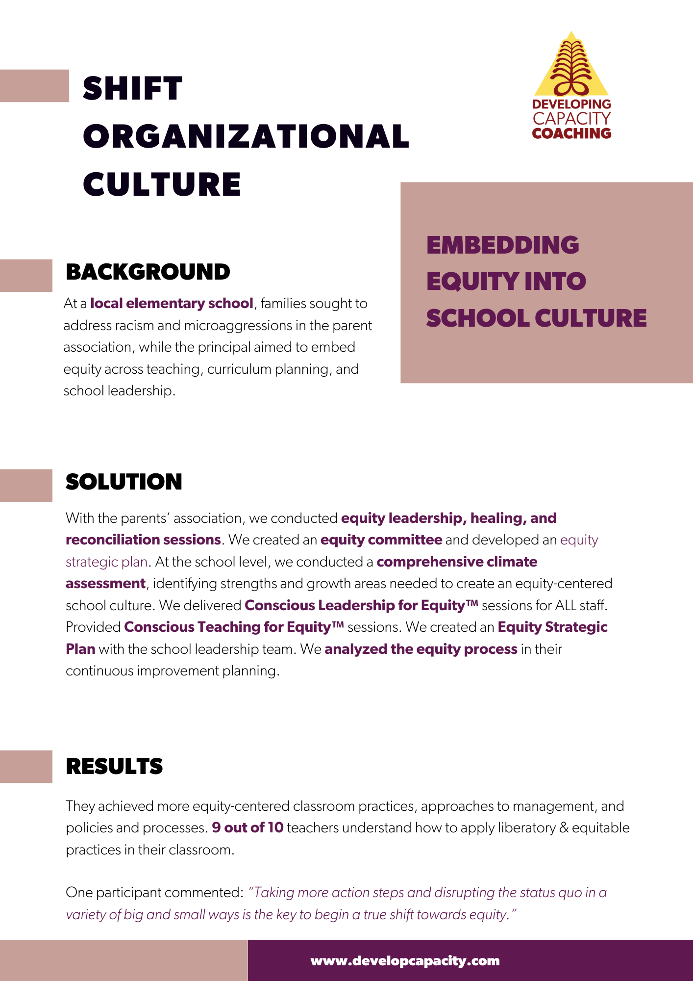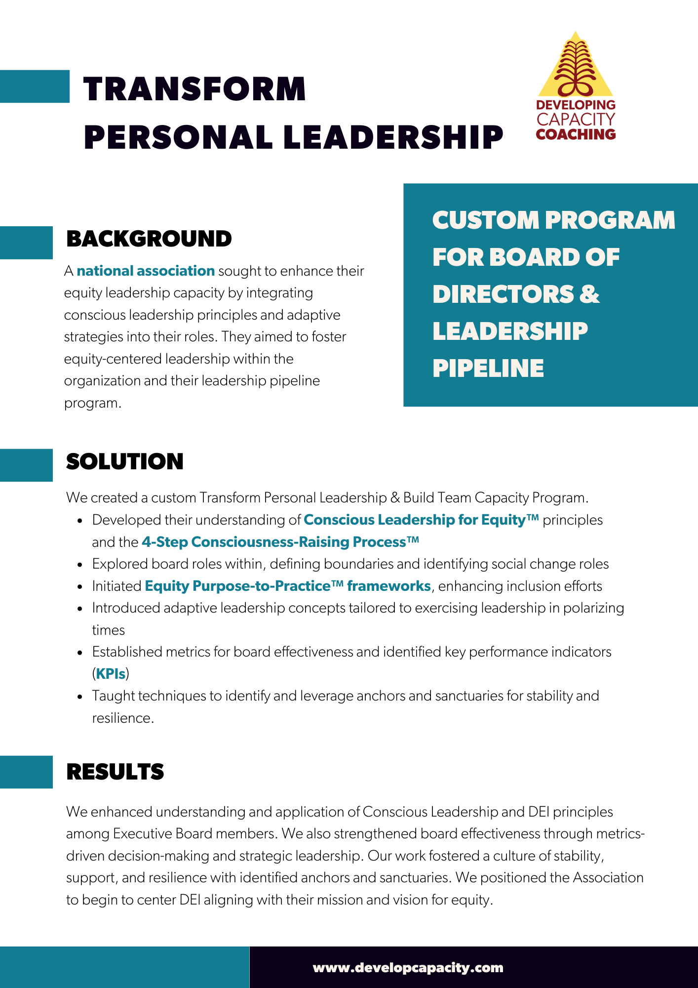 Our approach combines intentional onboarding, conscious leadership development, data-informed strategies, and context-specific blueprints to build organizational capacity and drive measurable change.