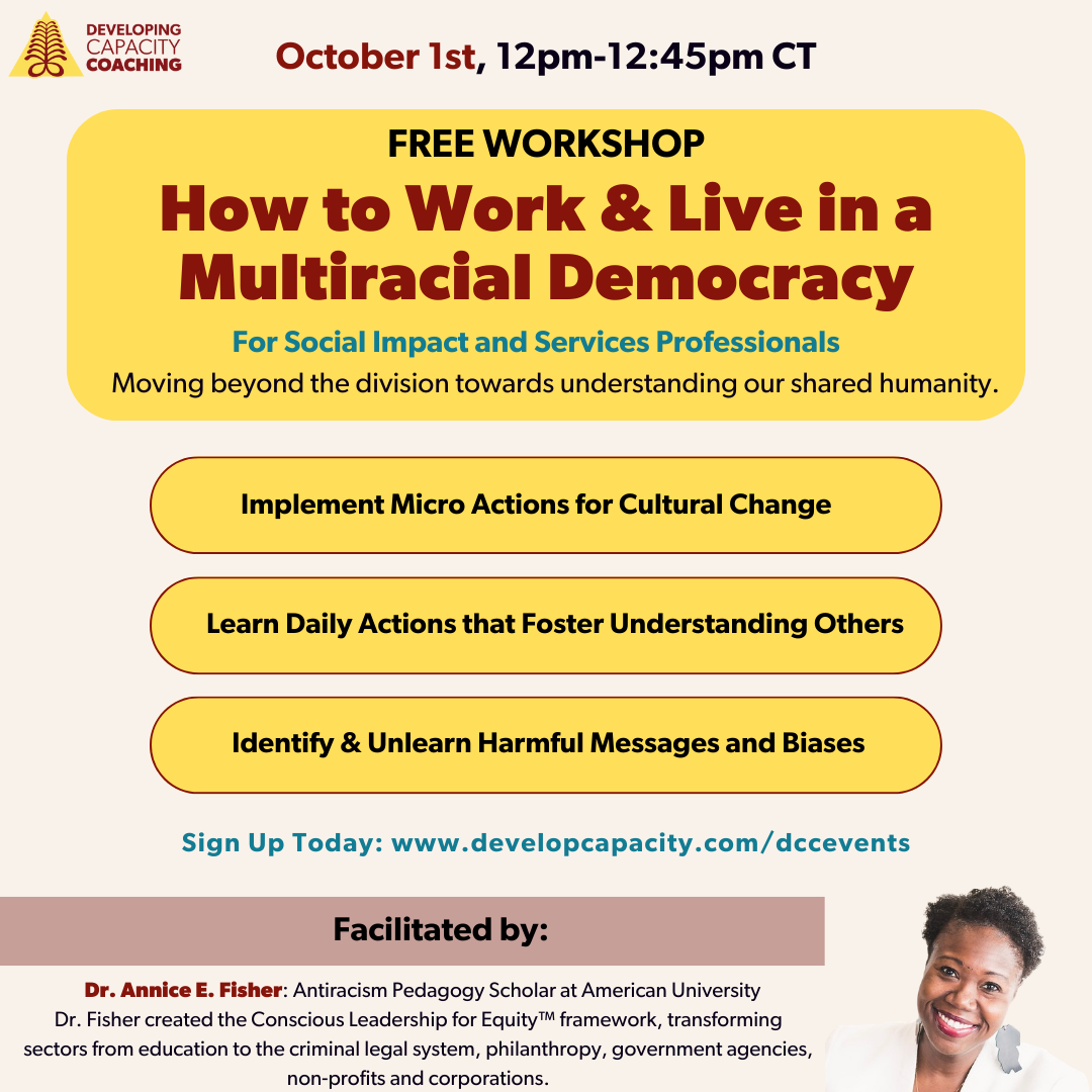 We're using our platform to create a space for healing and learning in our FREE How to Work & Live in a Multiracial Democracy Workshop for Social Impact and Services Professionals on Tuesday, October 1st at 12pm CT.
